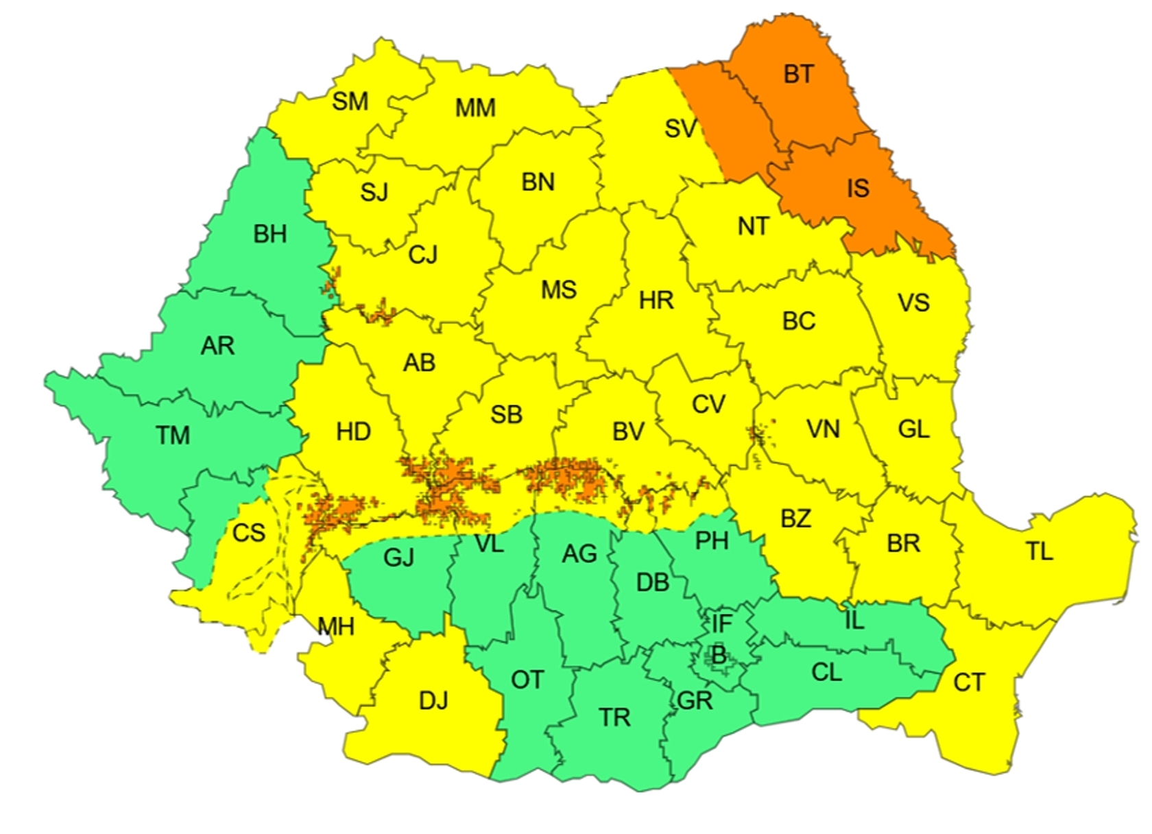Conform ANM, intensitatea maximă a fenomenelor în zona Moldovei se va înregistra joi, în intervalul orar 12:00 – 20:00. Județele Iași și Botoșani, precum și zona joasă a județului Suceava, se află sub incidența unui Cod Portocaliu.