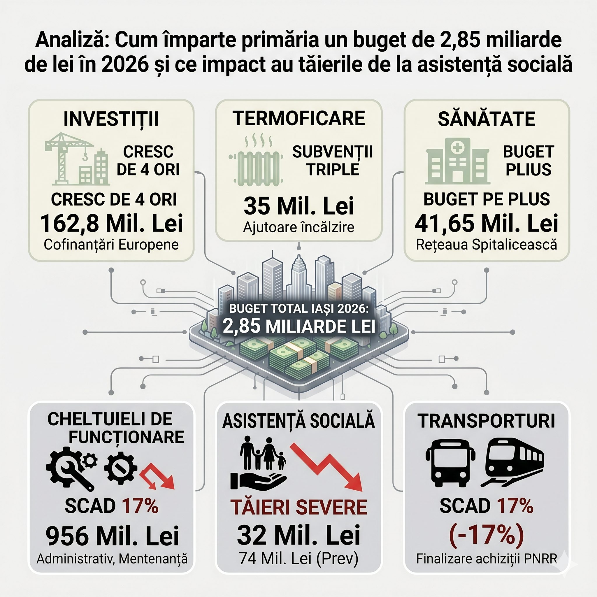 Pe de altă parte, triplarea subvenției pentru termoficare garantează că factura la întreținere pentru ieșenii rămași la sistemul de încălzire centralizată nu va exploda în iarna 2026-2027. Reducerea masivă de la asistență socială va limita însă plasa de siguranță a primăriei pentru categoriile vulnerabile, în afara celor vizate strict de ajutorul de căldură. Succesul acestui an depinde exclusiv de capacitatea primăriei de a semna și executa contractele din fonduri europene, singura variantă pentru ca dezvoltarea promisă să depășească stadiul cifrelor de pe hârtie.