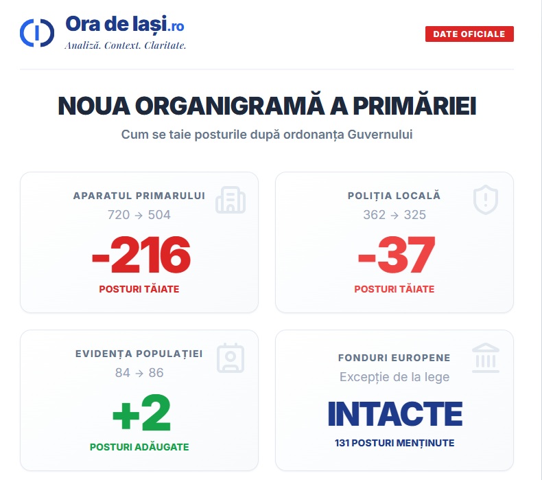 Până în acest moment, plafonul maxim aprobat de stat pentru Primăria Municipiului Iași număra 1.299 de posturi. Noul proiect de hotărâre reduce acest prag la 1.048 de posturi. Analiza documentației tehnice, inclusiv a raportului Serviciului de Resurse Umane, ne arată exact unde va lovi bisturiul guvernamental: