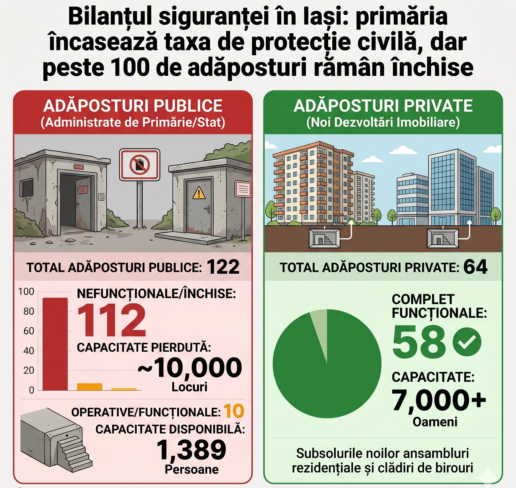 Dintre cele 122 de adăposturi aflate teoretic în administrarea publică (a primăriei sau a statului), abia 10 sunt declarate operative. Acestea pot oferi refugiu pentru 1.389 de persoane. Restul de 112 locații publice sunt nefuncționale, ceea ce anulează o capacitate de adăpostire de aproape 10.000 de locuri.