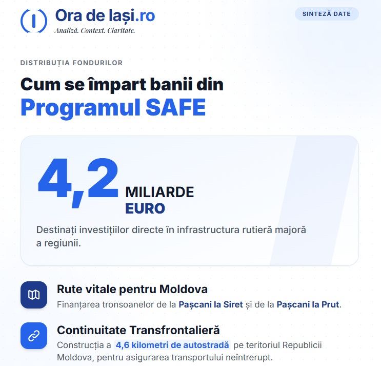 Președintele Consiliului Județean, Costel Alexe, a conturat o nouă perspectivă economică pentru Iași în cadrul TILIA – Summitul orașelor din România, desfășurat la Palatul Culturii. Discursul său a adus în prim-plan cifrele infrastructurii care urmează să scoată regiunea din izolare: 4,2 miliarde de euro alocate prin programul SAFE pentru autostrăzile A7 și A8, fonduri care redesenează complet rolul graniței de pe Prut în arhitectura Uniunii Europene.