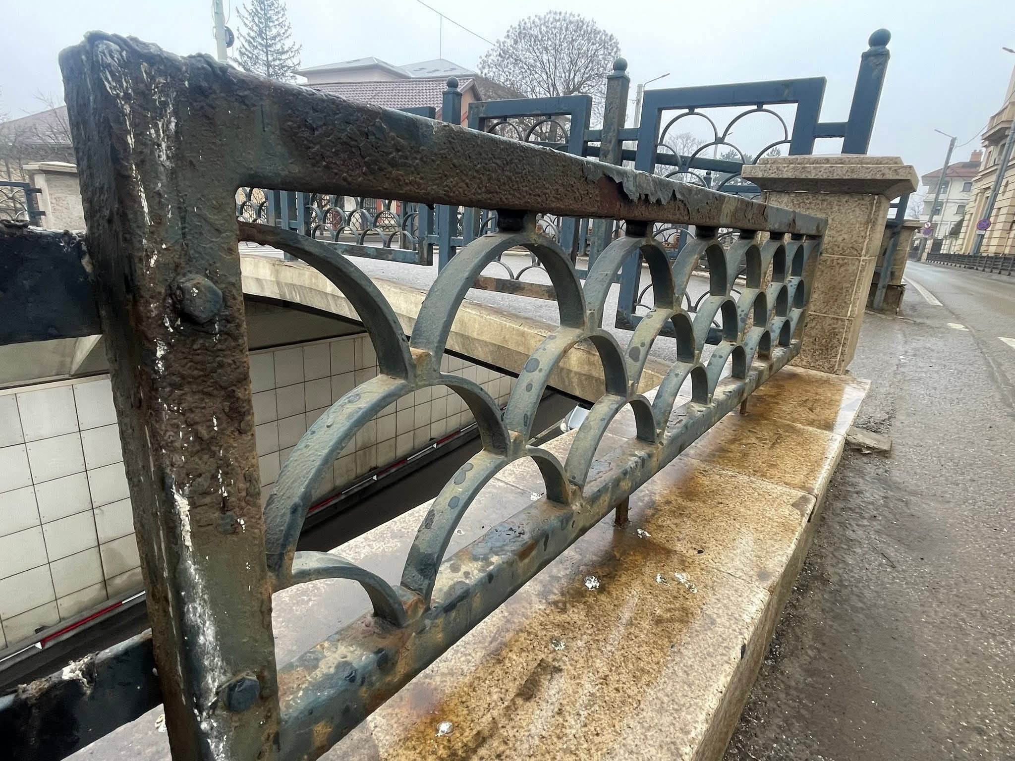 • Coroziunea elementelor de siguranță: Parapetele metalice menite să protejeze zonele pietonale prezintă un nivel ridicat de rugină, vopseaua anticorozivă fiind compromisă pe suprafețe extinse. Pe termen mediu, coroziunea reduce secțiunea utilă a metalului, diminuând capacitatea parapetului de a prelua șocul unui eventual impact auto.