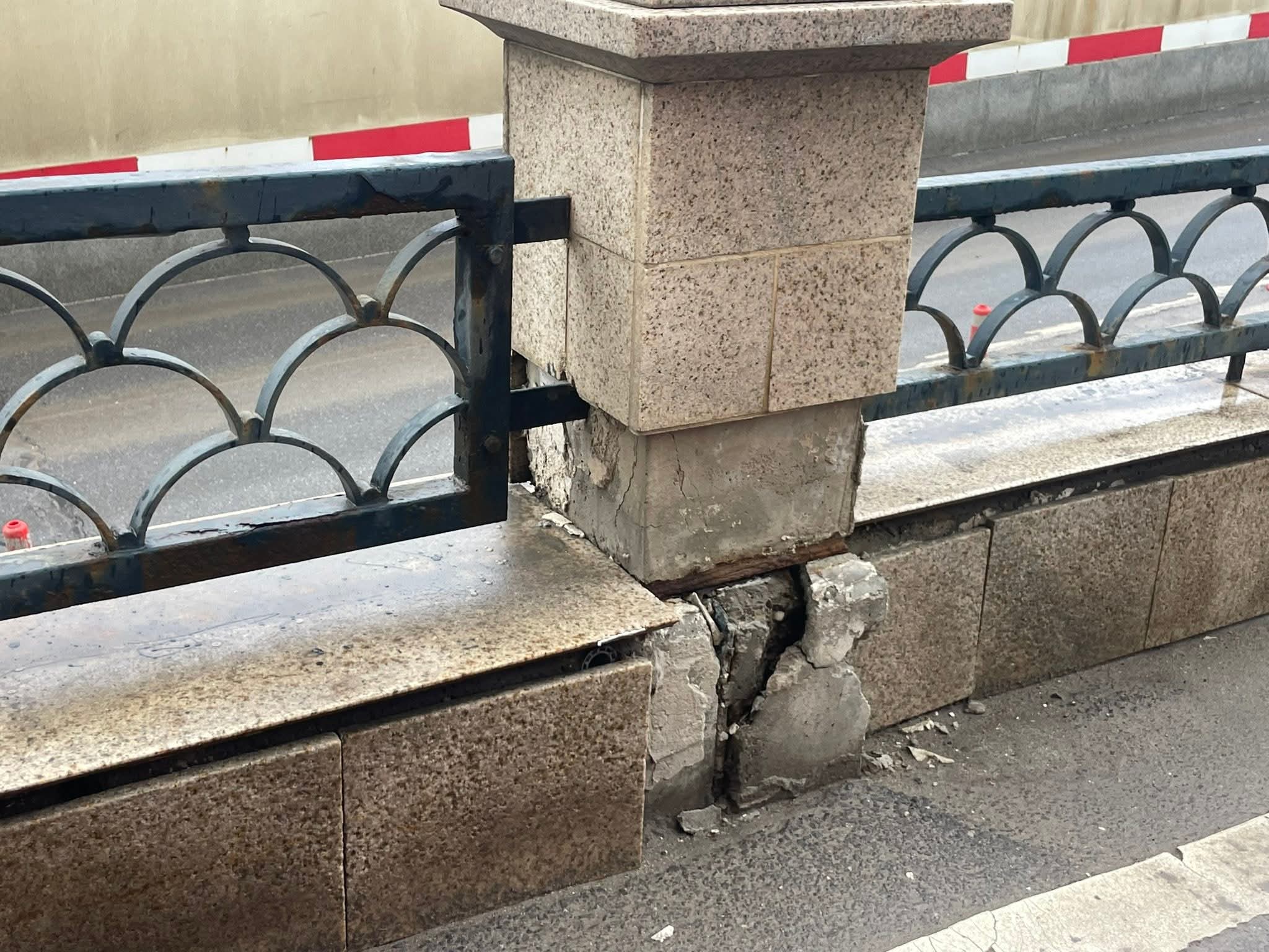 • Desprinderea placajelor grele: Segmente masive de granit s-au desprins de pe soclurile stâlpilor și de pe pereții de sprijin, ajungând pe trotuar și la marginea benzilor de rulare. Căderea necontrolată a acestor plăci, având în vedere greutatea lor, reprezintă un risc iminent de accidentare pentru pietoni sau de avariere a autovehiculelor în tranzit.