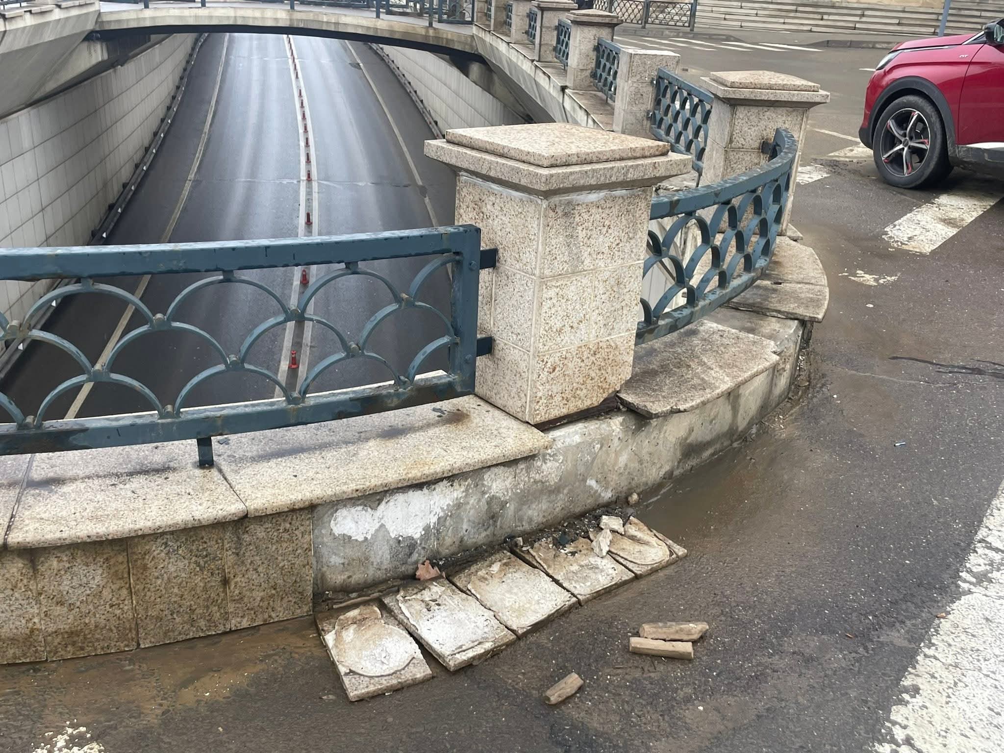 - Desprinderea placajelor grele: Segmente masive de granit s-au desprins de pe soclurile stâlpilor și de pe pereții de sprijin, ajungând pe trotuar și la marginea benzilor de rulare. Căderea necontrolată a acestor plăci, având în vedere greutatea lor, reprezintă un risc iminent de accidentare pentru pietoni sau de avariere a autovehiculelor în tranzit.
