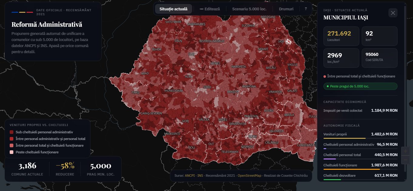 Dezbaterea privind reforma administrativă a României revine în atenția publică prin intermediul unui nou instrument digital. O aplicație interactivă, construită pe baza datelor oficiale ale statului și cu ajutorul inteligenței artificiale, expune dezechilibrele financiare de la nivelul administrațiilor locale. Platforma, dezvoltată de fostul parlamentar Cosette Chichirău, cartografiază raportul dintre veniturile încasate și cheltuielile de funcționare ale fiecărei comune și propune simulări concrete de comasare teritorială. Dincolo de componenta tehnică, demersul aduce în prim-plan o realitate statistică ignorată frecvent la nivel decizional: majoritatea localităților nu se pot susține financiar din propriile taxe.