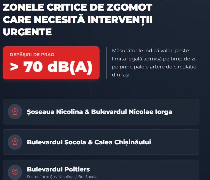 În aceste perimetre, indicatorii de presiune acustică la fațadele clădirilor depășesc limitele admise de legislația națională (Legea nr. 121/2019), impunând adoptarea unor soluții tehnice și administrative imediate.