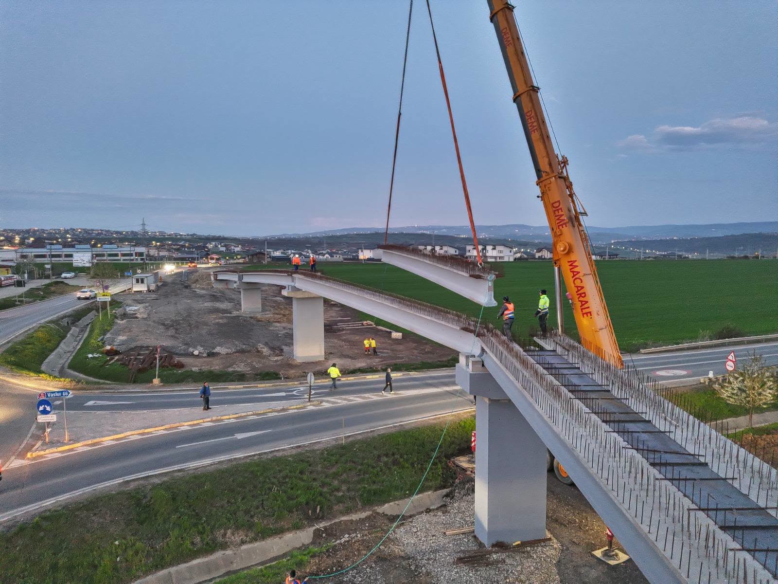 Lucrările de construcție a pasarelei velo și pietonale din comuna Miroslava au avansat în această săptămână prin montarea grinzilor peste drumul național DN 28D (Varianta de Ocolire Iași Sud), în zona sensului giratoriu de la Valea Ursului. Proiectul, finanțat din fonduri de mediu, reprezintă prima structură de acest tip construită peste un drum național în județul Iași și are ca obiectiv declarat separarea traficului vulnerabil de fluxul auto de tranzit și navetă.