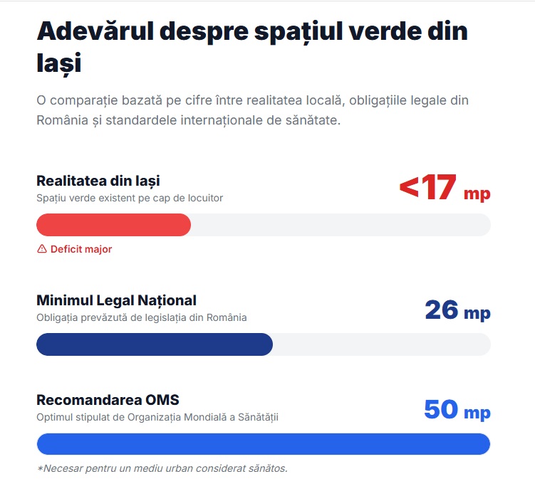 De aproape un secol, municipiul Iași nu a mai adăugat pe harta sa un parc public de mari dimensiuni. În timp ce alte centre urbane din România atrag finanțări europene de zeci de milioane de euro pentru a construi păduri urbane de la zero, administrația ieșeană menține orașul la un deficit alarmant: ieșenii beneficiază în realitate de sub 17 metri pătrați de spațiu verde pe cap de locuitor. Această cifră se află mult sub minimumul legal național de 26 de metri pătrați și la o distanță uriașă de recomandarea Organizației Mondiale a Sănătății (OMS), care stipulează un optim de 50 de metri pătrați pentru un mediu urban sănătos.