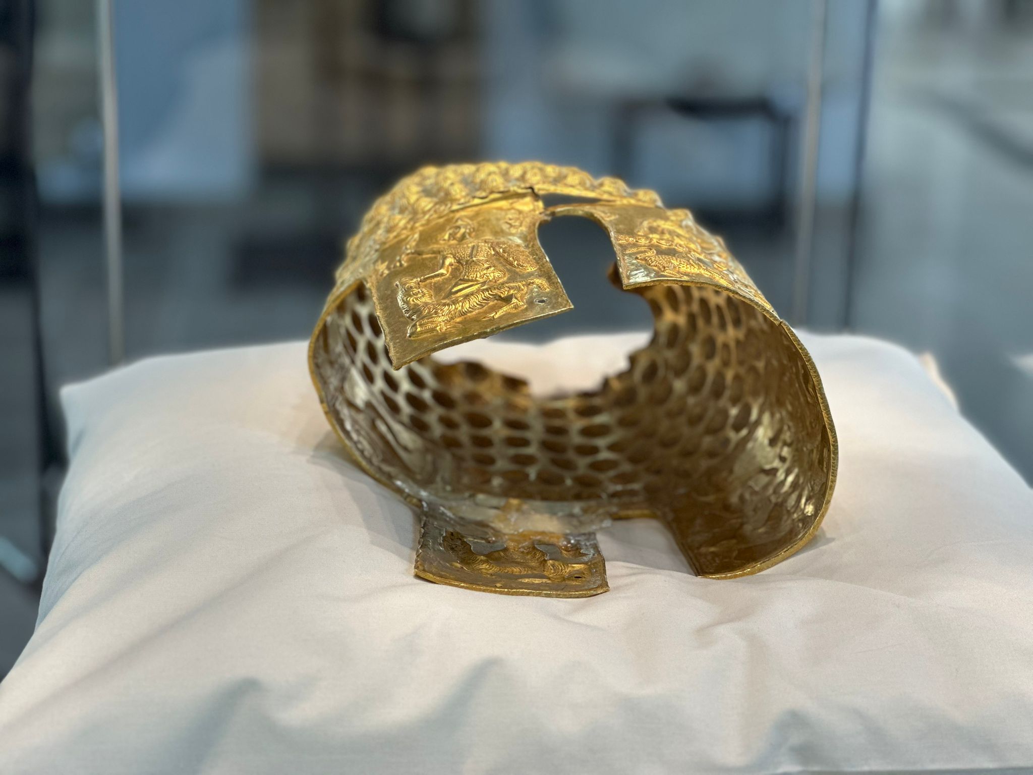 - Corectarea aplatizării: În prezent, coiful prezintă o ușoară deformare a calotei sferice. Redarea geometriei (diametrului) inițiale este etapa care necesită cel mai înalt grad de precizie. Restauratorii vor aplica proceduri de detensionare a metalului pentru a corecta forma, minimizând riscul de fisurare a materialului vechi de aproximativ 2.400 de ani și protejând basoreliefurile.