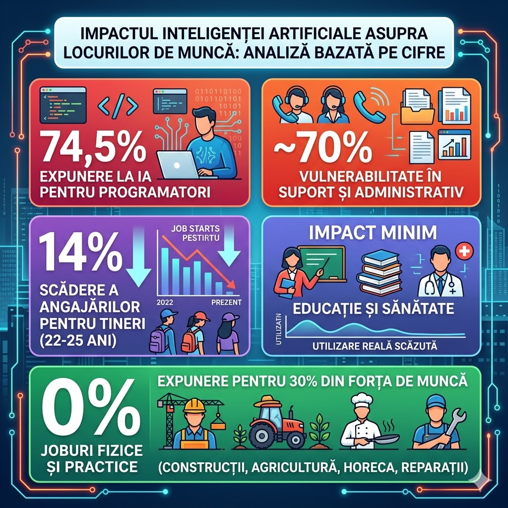 În luna martie 2026, compania americană Anthropic a publicat un raport exhaustiv care schimbă radical modul în care înțelegem impactul inteligenței artificiale (AI) asupra locurilor de muncă. Depășind estimările pur teoretice din anii trecuți, noul studiu măsoară exact ce sarcini au fost deja preluate de AI în mediul de lucru real. Deși nu asistăm încă la valuri de concedieri masive, datele arată o „contracție tăcută” a pieței: companiile reduc discret posturile disponibile, lăsând tinerii absolvenți să se confrunte cu o realitate mult mai dură pentru pozițiile de entry-level.