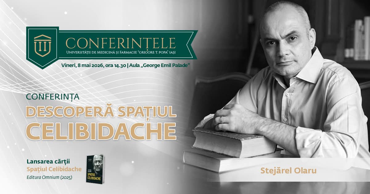 Universitatea de Medicină și Farmacie „Grigore T. Popa” din Iași (UMF) organizează vineri, 8 mai 2026, ora 14:30, conferința „Descoperă spațiul Celibidache”, susținută de istoricul Stejărel Olaru în Aula „George Emil Palade”. Evenimentul include lansarea volumului biografic omonim, publicat la Editura Omnium în 2025. O particularitate a acestei ediții este decizia asumată a organizatorilor de a nu transmite evenimentul online, o alegere curatorială care amintește direct de principiile cunoscute ale dirijorului Sergiu Celibidache privind receptarea muzicii.