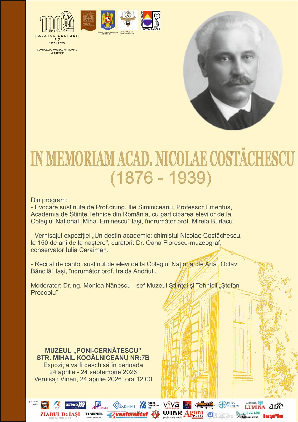 Manifestarea de vineri include vernisajul expoziției documentare „Un destin academic: chimistul Nicolae Costăchescu, la 150 de ani de la naștere”. Valoarea acestui demers, curatoriat de dr. Oana Florescu și conservatorul Iulia Caraiman, rezidă în parteneriatul cu Direcția Județeană a Arhivelor Naționale Iași.