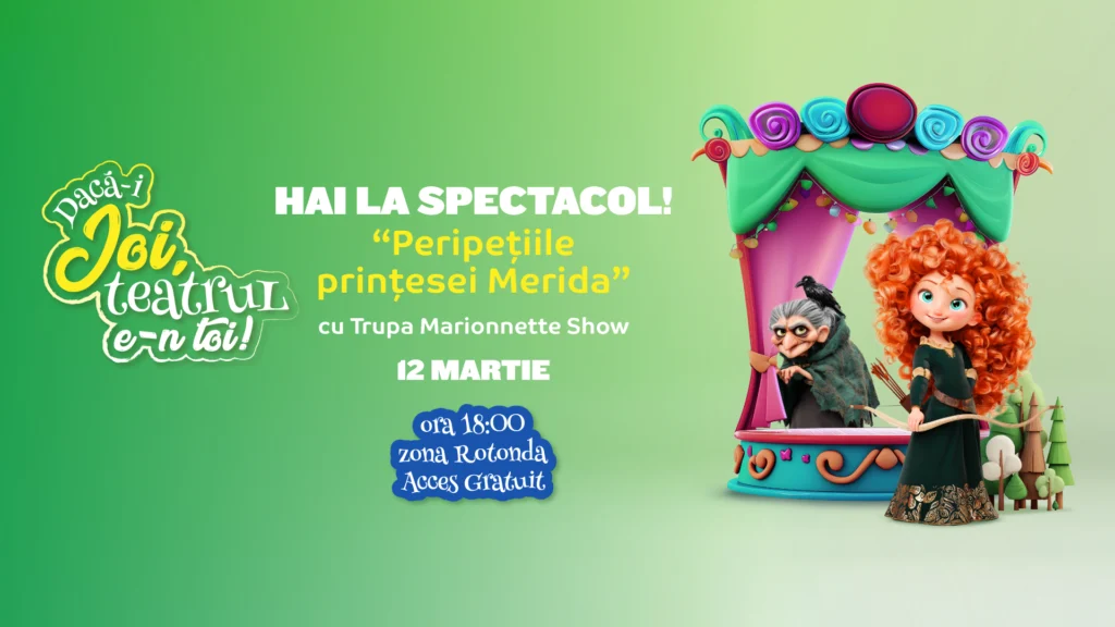 O seară magică de teatru așteaptă familiile ieșene! Pe 12 martie 2026, începând cu ora 18:00, în Rotonda Mall Moldova, Trupa Marionnette Show va prezenta spectacolul „Peripețiile Prințesei Merida”, cu acces liber pentru toți copiii și părinții.