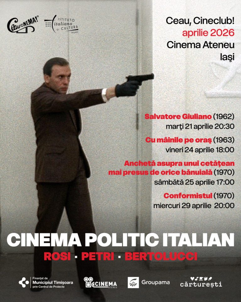 Între 21 și 29 aprilie 2026, Cinema Ateneu, în parteneriat cu Institutul Italian de Cultură, organizează o retrospectivă dedicată cinematografiei politice italiene din anii ’60 și ’70. Programul include patru producții multipremiate la nivel internațional, prezentate în versiuni restaurate. Selecția abordează, din perspectivă istorică, teme cu relevanță recurentă în spațiul public: mecanismele puterii de stat, dezvoltarea urbană și integritatea sistemului judiciar.