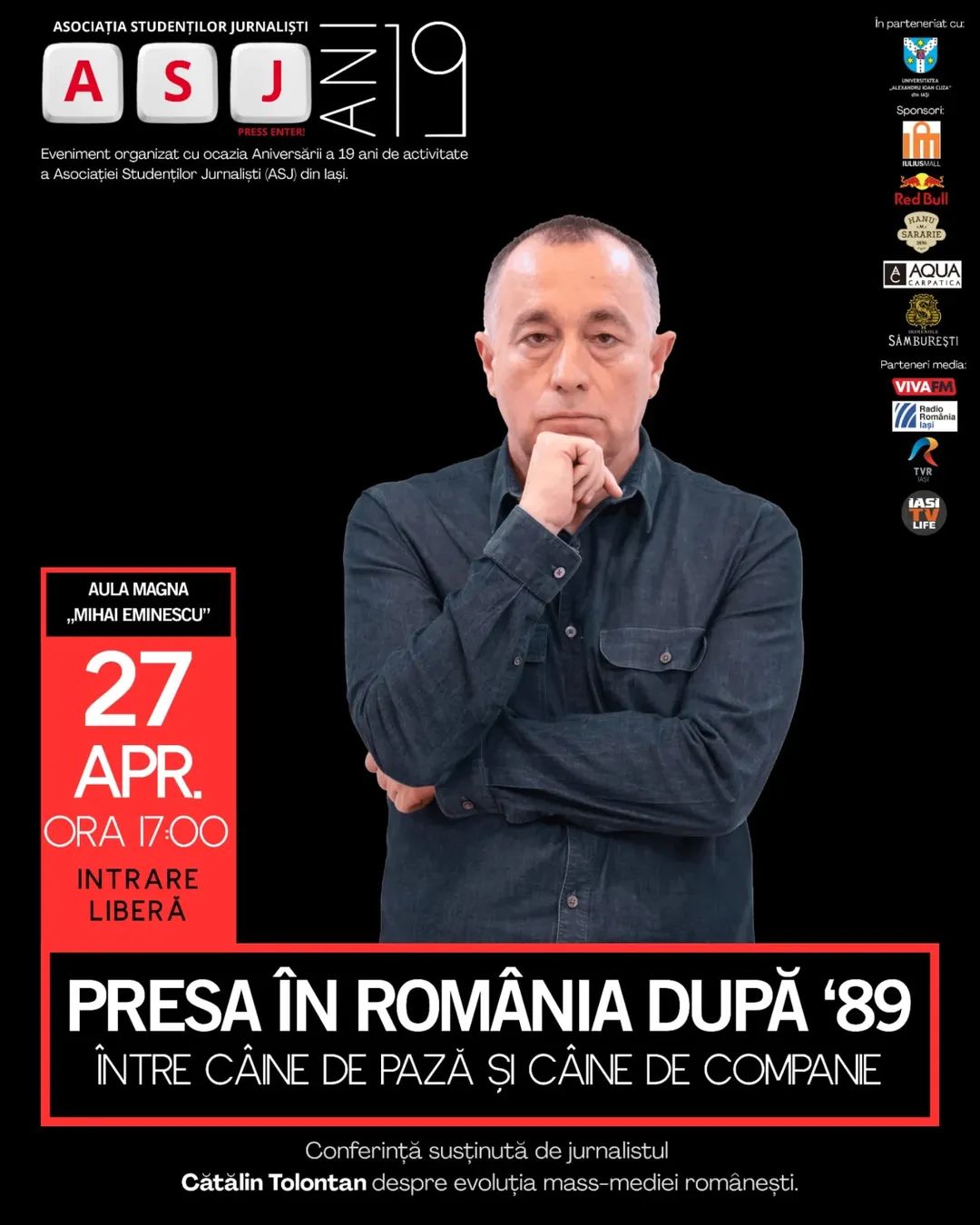 Într-o perioadă marcată de schimbări structurale pe piața media și de discuții recurente privind independența editorială, rolul jurnalismului în spațiul public necesită o evaluare constantă. Asociația Studenților Jurnaliști din Iași (ASJ) marchează 19 ani de activitate printr-un eveniment care propune o analiză a evoluției breslei. Luni, 27 aprilie 2026, jurnalistul Cătălin Tolontan va participa la o conferință organizată în Aula Magna a Universității „Alexandru Ioan Cuza”, pentru o dezbatere aplicată despre libertatea de exprimare, cadrul economic al presei și impactul canalelor de comunicare moderne.