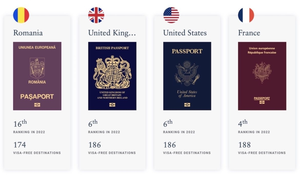 Valoarea unui pașaport în clasamentele de profil este determinată strict de numărul de state care permit accesul titularului fără a solicita o viză obținută în prealabil prin procedură consulară. În 2026, clasamentul este condus de Emiratele Arabe Unite (scor 181), urmate de Singapore (175) și de un grup de state europene cu 173 de puncte (Franța, Germania, statele nordice). Cu un scor de 171 de puncte, România se plasează înaintea unor state anglo-saxone cu tradiție în topul mobilității: Regatul Unit și Canada (ambele cu 169 de puncte), respectiv Statele Unite ale Americii (167 de puncte).