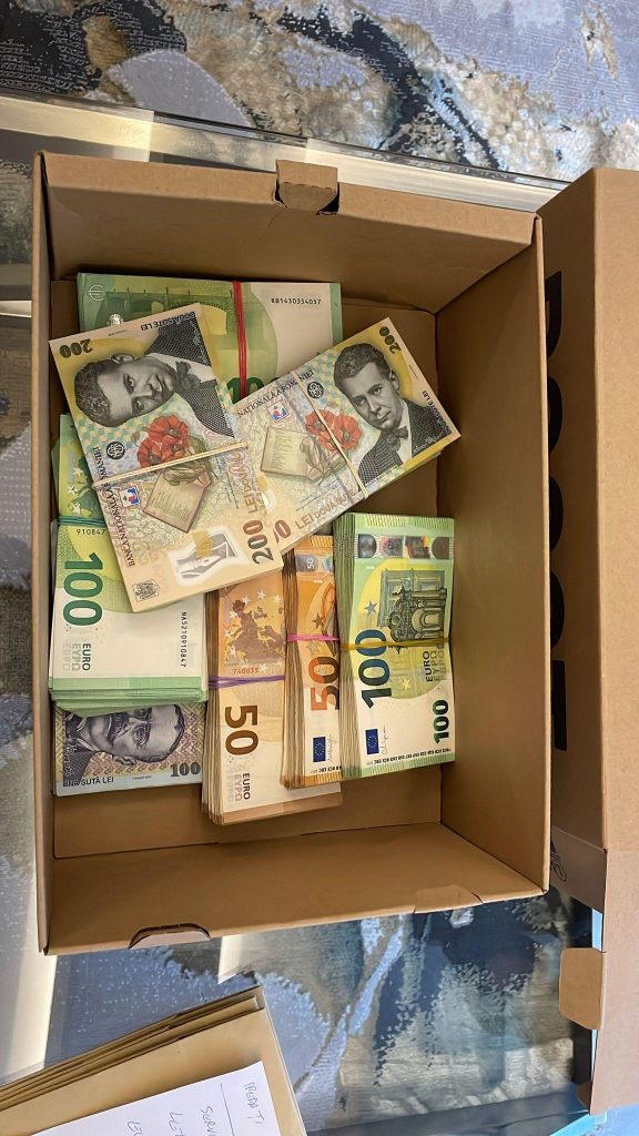 • Suma descoperită la domiciliu: Aproximativ 500.000 de euro (350.000 de euro inițial identificați, urcați la 500.000 după percheziții amănunțite).