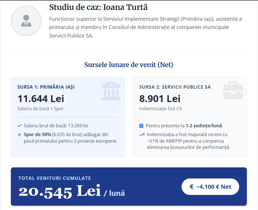 Exemplul care ilustrează cel mai bine mecanismul financiar din spatele acestor numiri este cel al Ioanei Turtă, actual membru în CA la Servicii Publice și asistentă a primarului Mihai Chirica, în urma analizei a publicației ReporterIS.