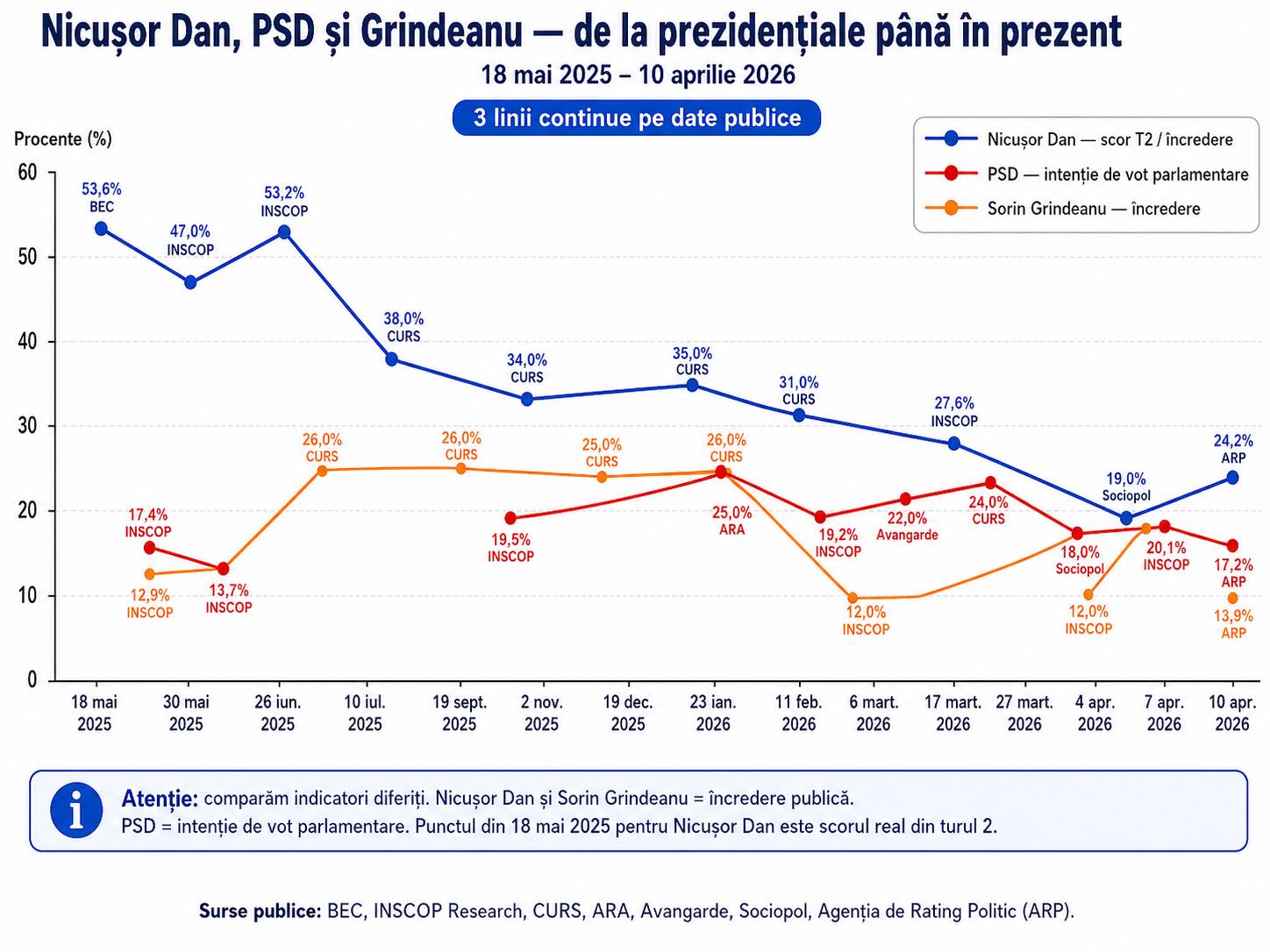 Declinul președinteului are o explicație politică imediată. Electoratul său a sancționat apropierea de PSD. Partidul condus de Sorin Grindeanu se află într-o pantă descendentă vizibilă și a încetat să mai genereze mesaje legate de stabilitate. Prin asocierea cu această structură, președintele țării a decontat imaginea partenerilor săi de discuții.