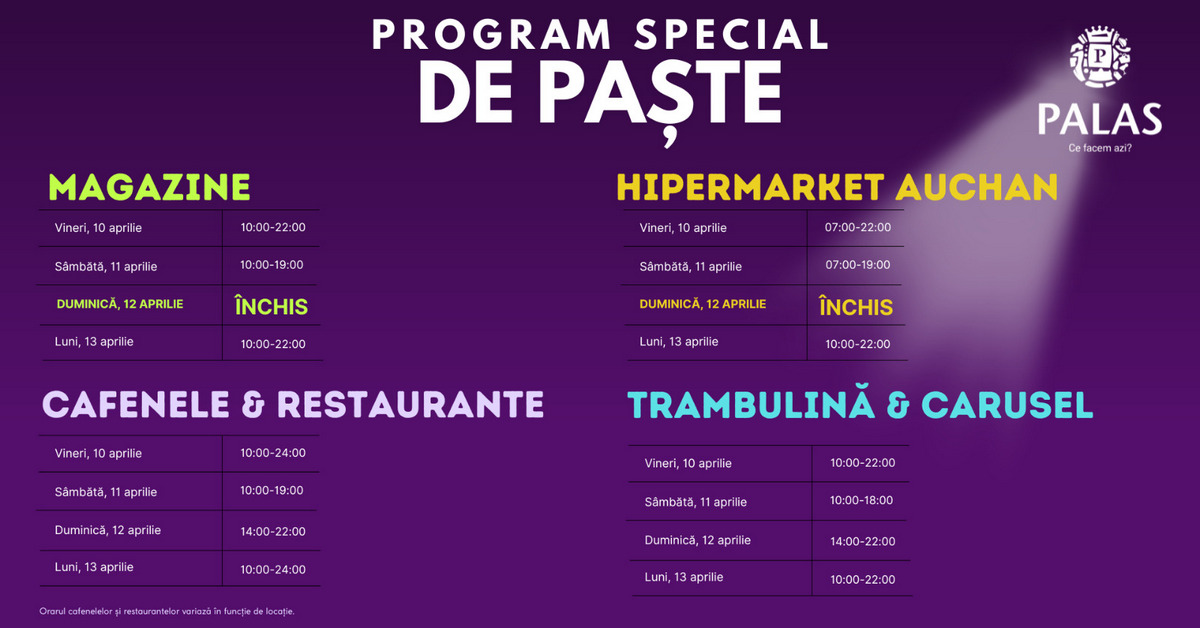 Este acel moment din an când ne bucurăm de liniște, de începutul primăverii și de clipe petrecute alături de cei dragi. De sărbătorile pascale, Palas are un program special, adaptat astfel încât să nu îți lipsească nimic din cele necesare, dar și să ne bucurăm cu toții de timpul petrecut împreună cu cei dragi.